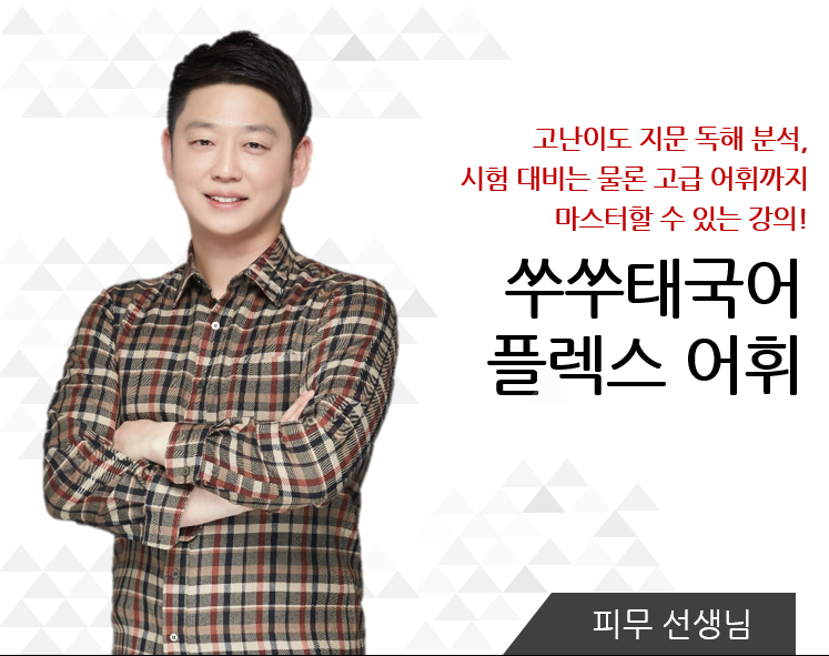 | 강좌특징 | 진짜 태국어가 나타났다! 태국어 FLEX 시험을 준비하시는 분들을 위한 찐 태국어! 고난이도 지문 독해 분석, 시험 대비는 물론 고급 어휘까지 마스터할 수 있는 강의! 태국어 절대강자 피무 선생님과 함께해요! *태국어 플렉스 어휘 완전 정복으로 시험 대비는 물론, 고급 어휘 구사가 가능해진다!