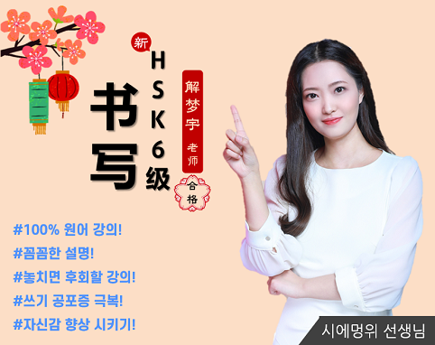 | 수강대상 | 1. 新HSK6급 고득점을 목표로 하시는 분 2. 중국어 문장 쓰기가 늘 막막하셨던 분 3. 新HSK6급 쓰기의 작성 노하우를 배우고 싶으신 분 |