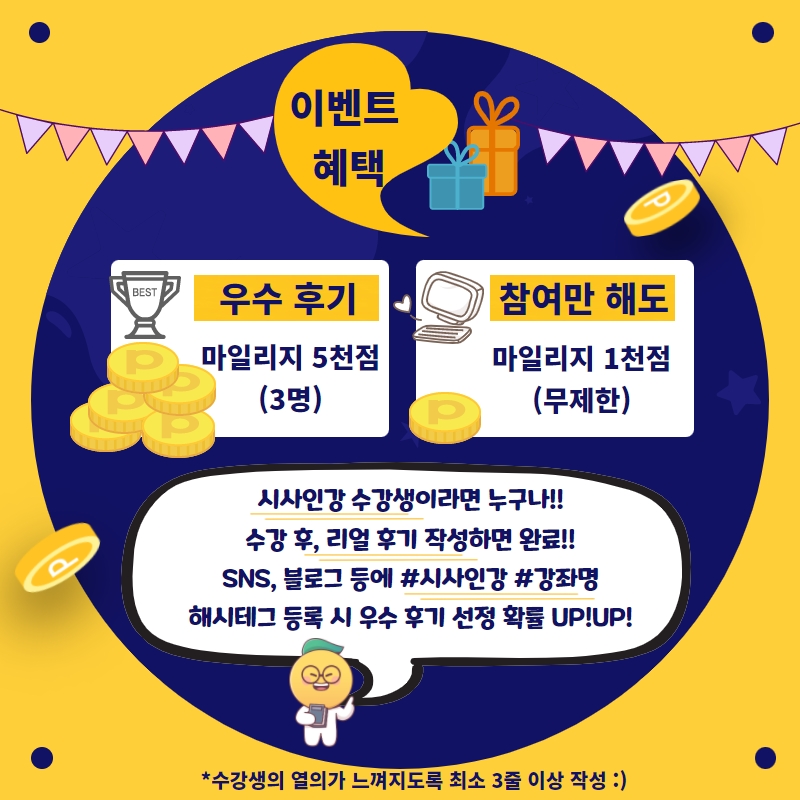 👉참여 방법: 강의 수강 후, 리얼한 후기만 작성하면 참여 완료!! (*강의 수강 후기와 관계 없는 내용은 당첨자 선정에서 제외됩니다.) 👉우수 후기 선정 꿀팁🍯 1) 인증샷과 함께 수강후기를 작성한다!! 2)구구절절 수강생의 열의가 느껴지도록 겁나 길게 작성한다!!! 3)SNS, 블로그 등에 #시사인강 #강좌명 해시태크와 함께 수강후기를 업로드한다!! *주의 사항: 수강생의 열의가 느껴지도록 최소 3줄 이상 작성 :)